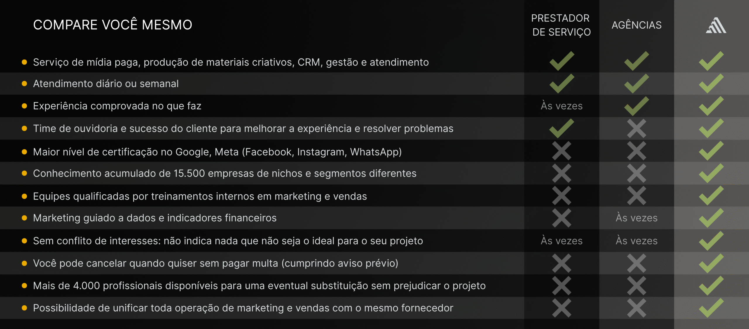 Diferente de agências tradicionais, não vendemos serviços isolados. Trabalhamos como extensão da sua equipe, cuidando de todo o ecossistema de marketing e vendas para que sua empresa cresça com previsibilidade.